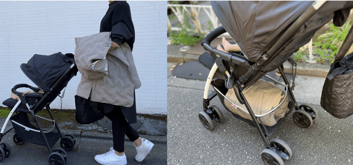 ロング丈なのに、重く見えない細見えデザイン。コンパクトに畳めるので、ベビーカーの荷台にも入れることができて便利です。