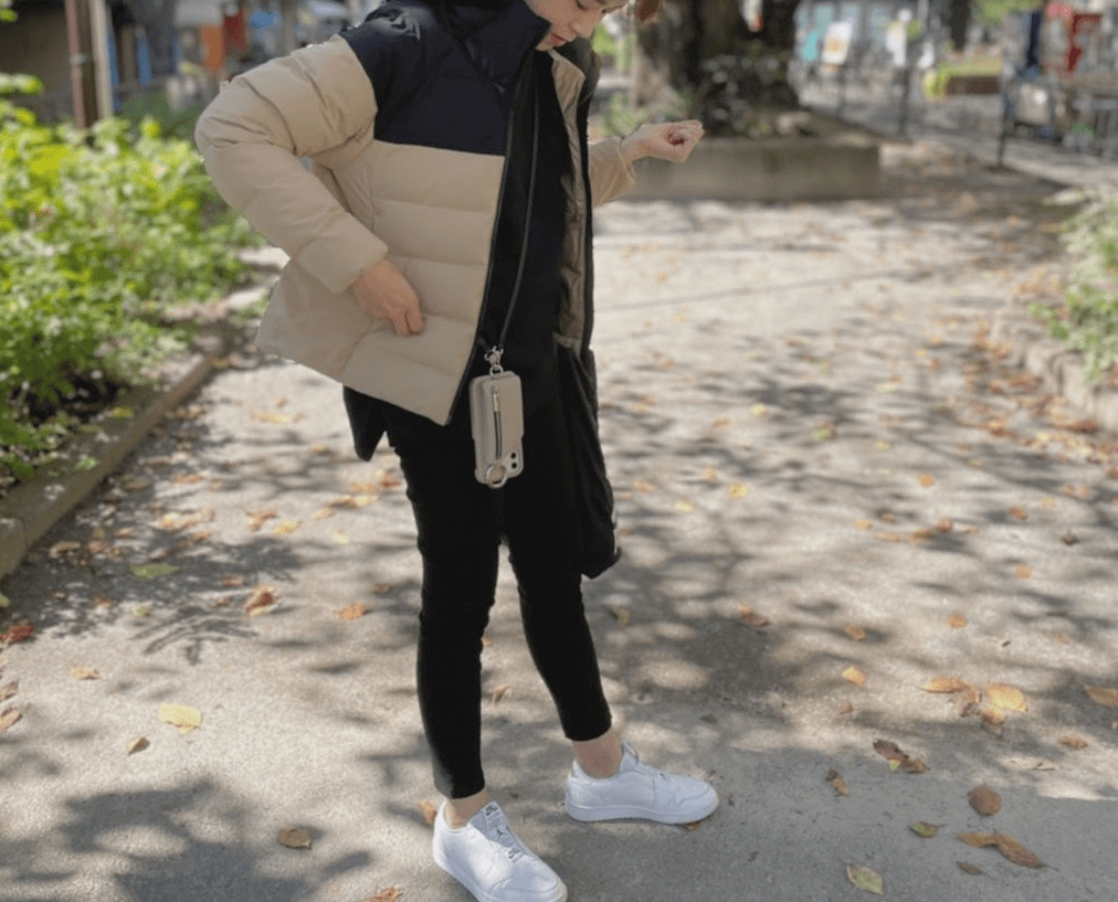 最近、近所のショップへの買い物は、スマートフォンと買い物袋だけを持った身軽な装い。ジャケットと同じ柄のスマホケースで統一感を出しました。全身3色までに抑えたシンプルなカラーコーディネート。