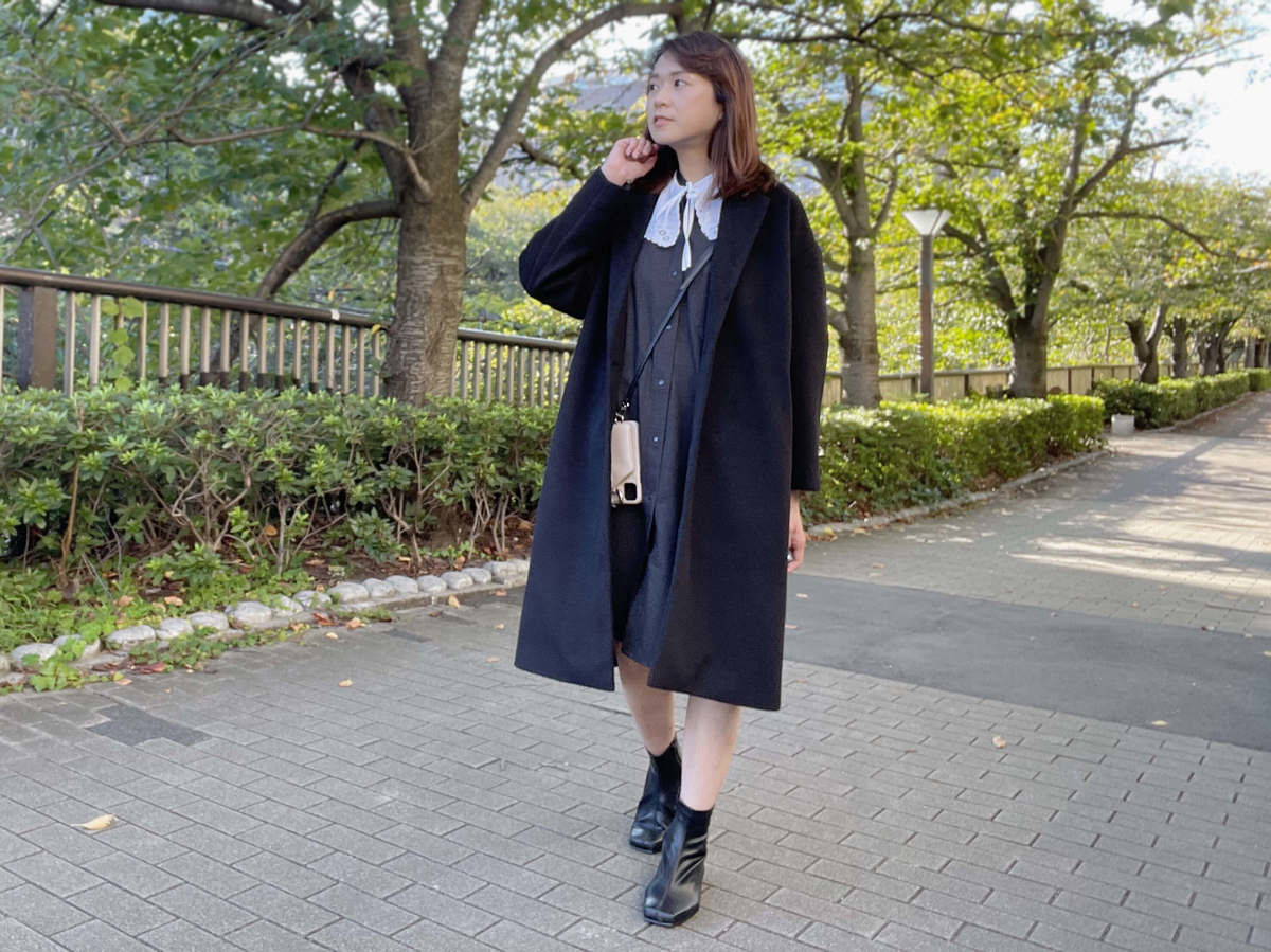 テーラードコートの丈に合わせて、膝丈のワンピをチョイス。シンプルなシルエットだからこそ、アクセントにトレンドアイテムの付け襟やローファーで今っぽさを出しました。