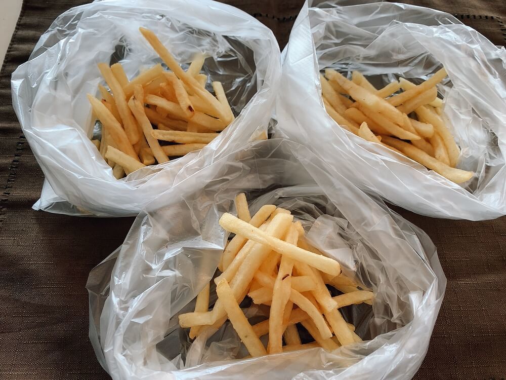 フライドポテトを3等分に分けて、それぞれシーズニングを入れ、袋ごとよく振って味を馴染ませていきます。
