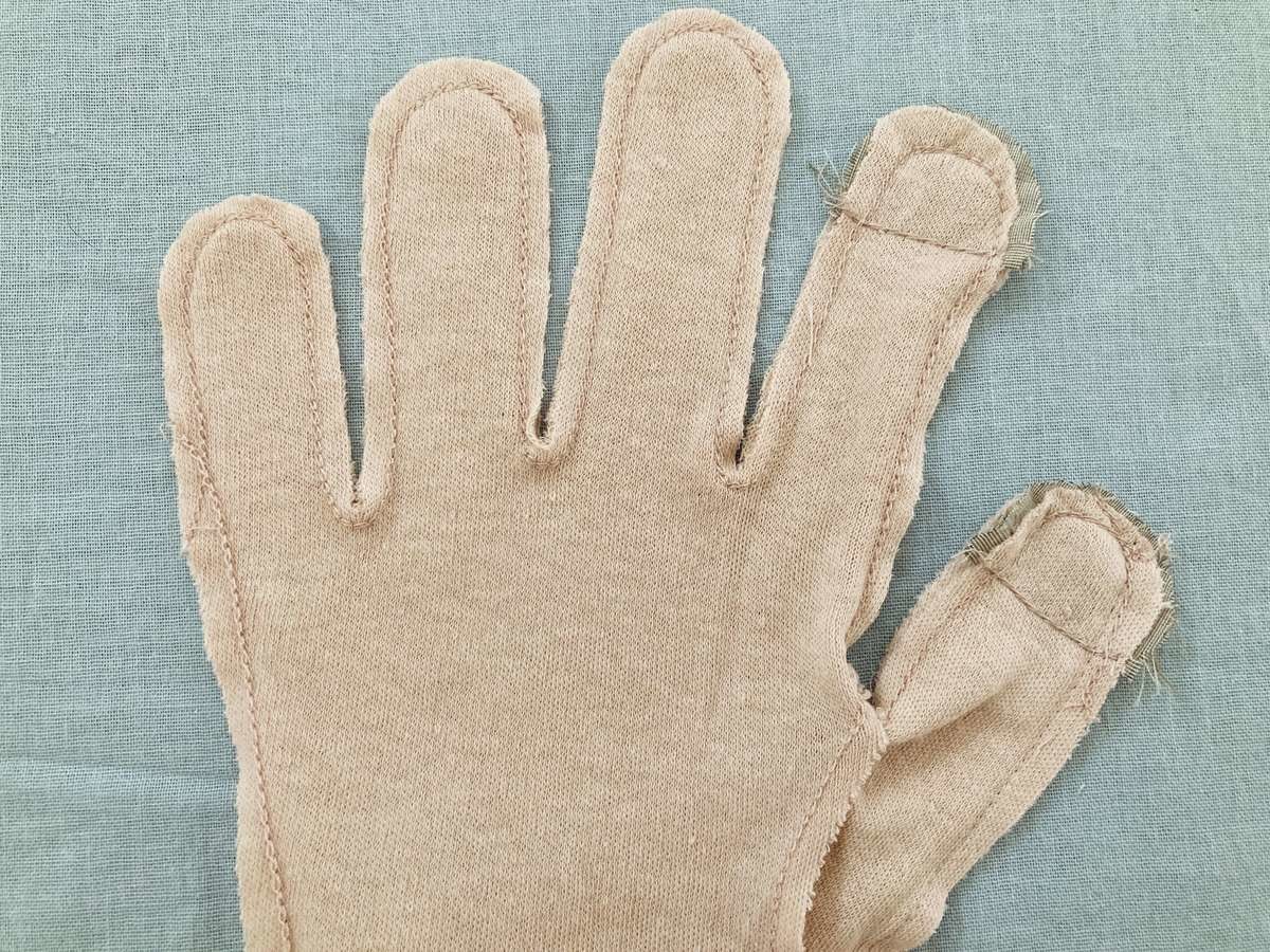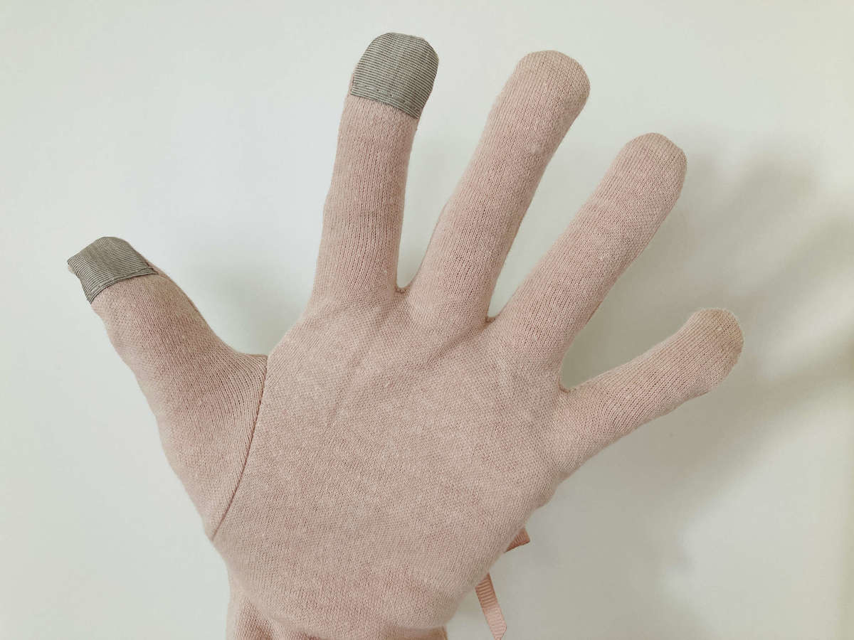 保湿用グローブの裏側は、タッチパネル対応生地に触れないようになっています。タッチパネル対応生地は若干固めなので心配していましたが、内側は綿100%です。