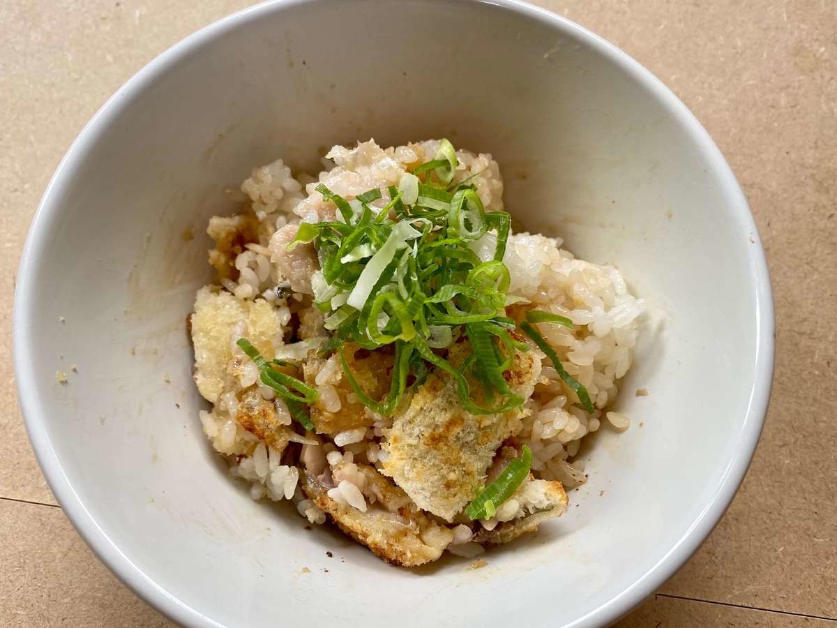 ボウルに茶碗1杯分のご飯、カットしたアジフライ、タレ適量を加え混ぜ合わせる。器に盛り、刻んだ青ネギを散らしたら完成!