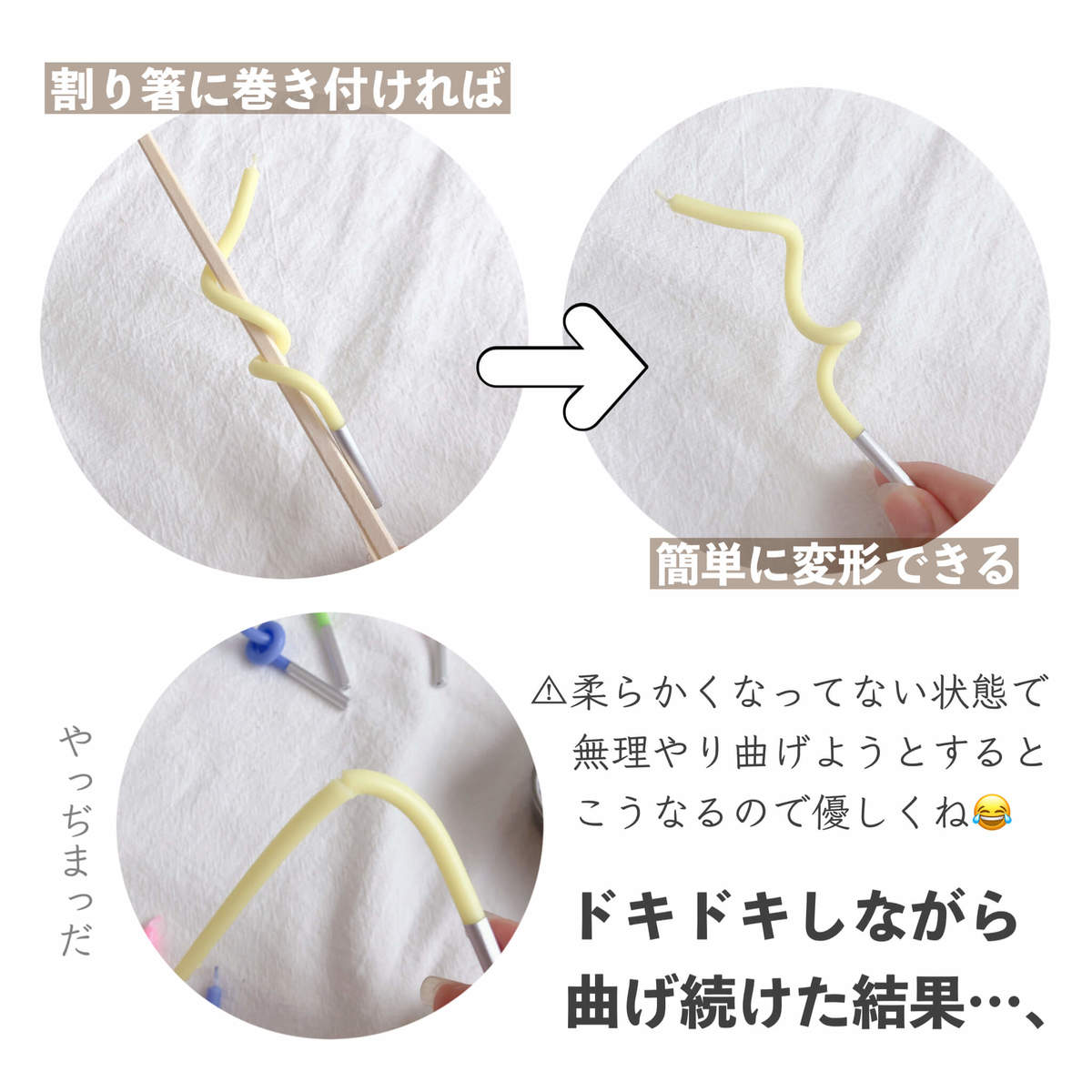 充分に柔らかくなっていない状態で無理やり曲げようとすると、折れてしまうので優しく扱ってください。