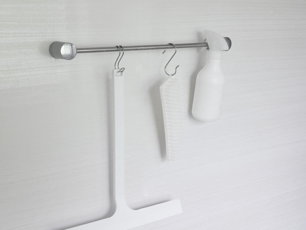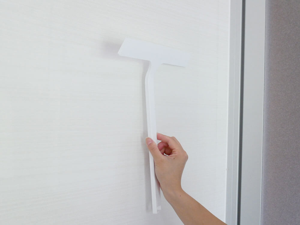 こちらの「水切りワイパー」は、フックなどにも掛けられるよう持ち手の先に穴があいているので、フックを利用すれば磁石がつかない浴室でも浮かせる収納が叶いますよ♪