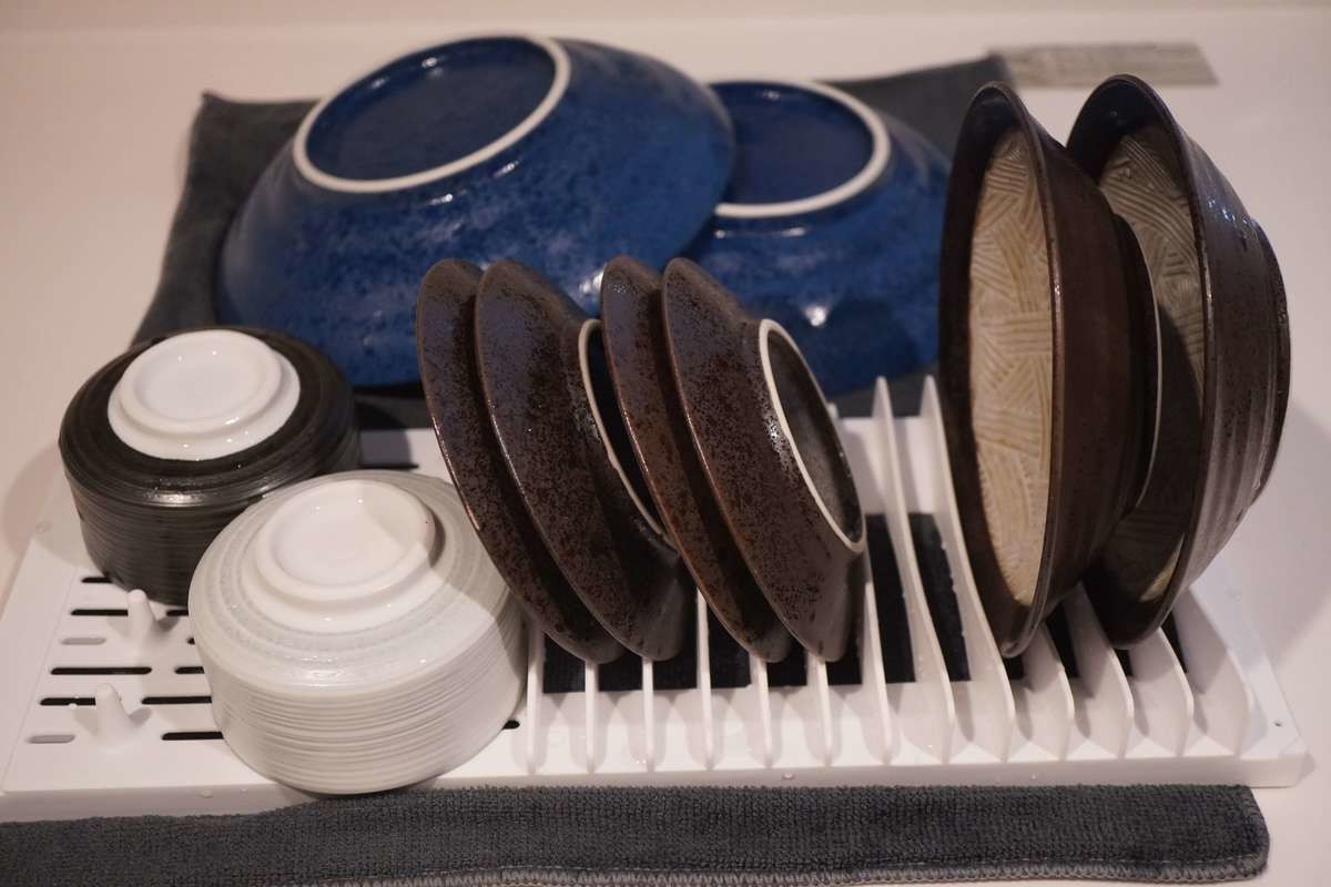 平皿を立てることでマットのみを使用した時よりたくさんんの食器を水切りマットの上に置くことができます。