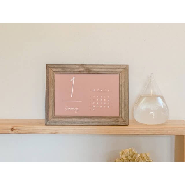 カラーのカレンダーはちょっと…という方にもおすすめしたい、トレンド感を意識した、くすみカラーがポイント。フォトフレームに入れたり、マスキングテープで直接壁に貼ったりと自分なりのアレンジで飾れる作品です!