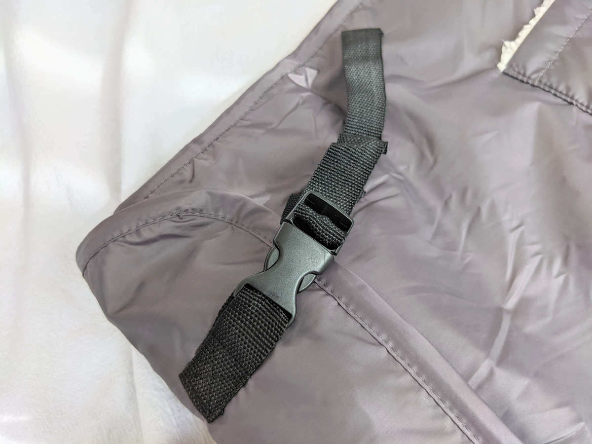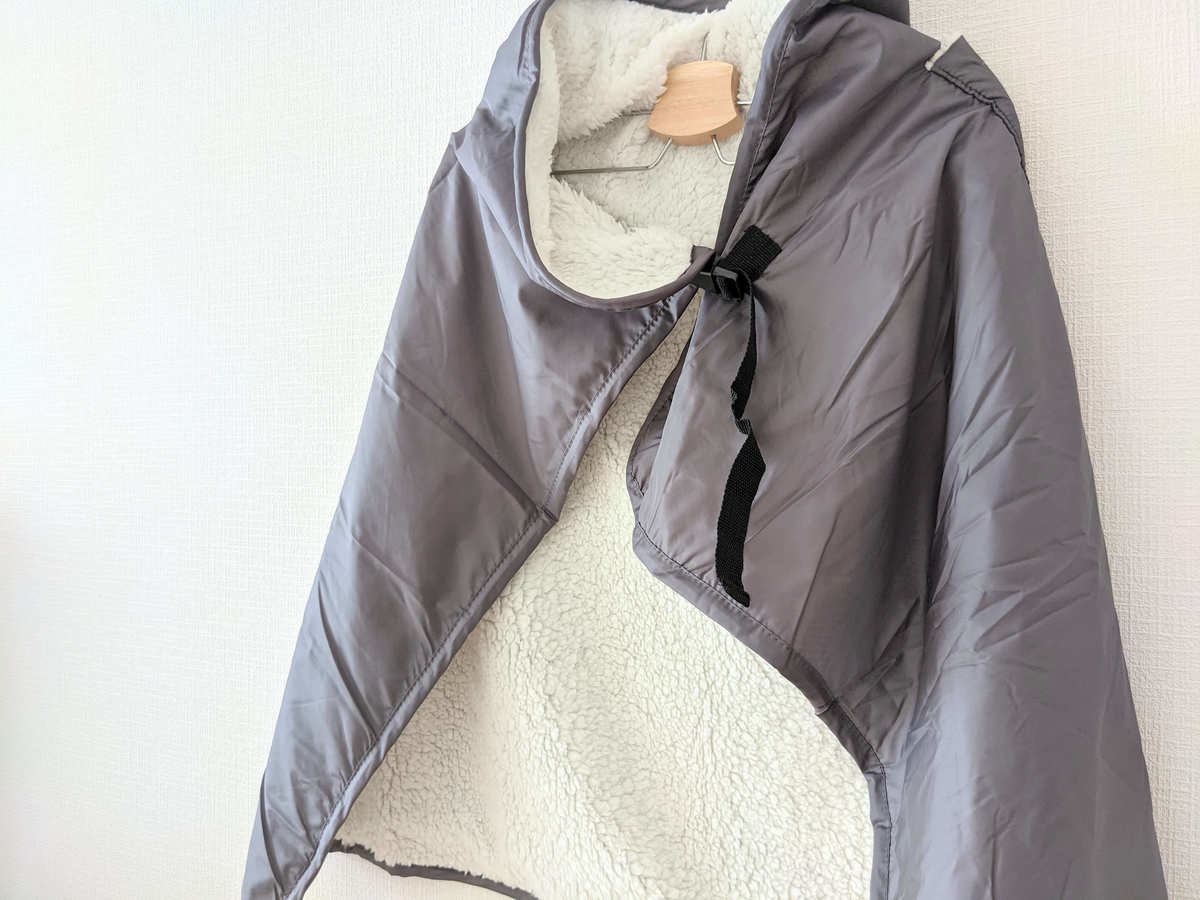 普通のブランケットでも肩掛けはできますが、ここでもアジャスターが良い仕事をしてくれます。 カチッと留めておけばズレ落ちないので、家の中を移動する際もストレスなく使えますよ。