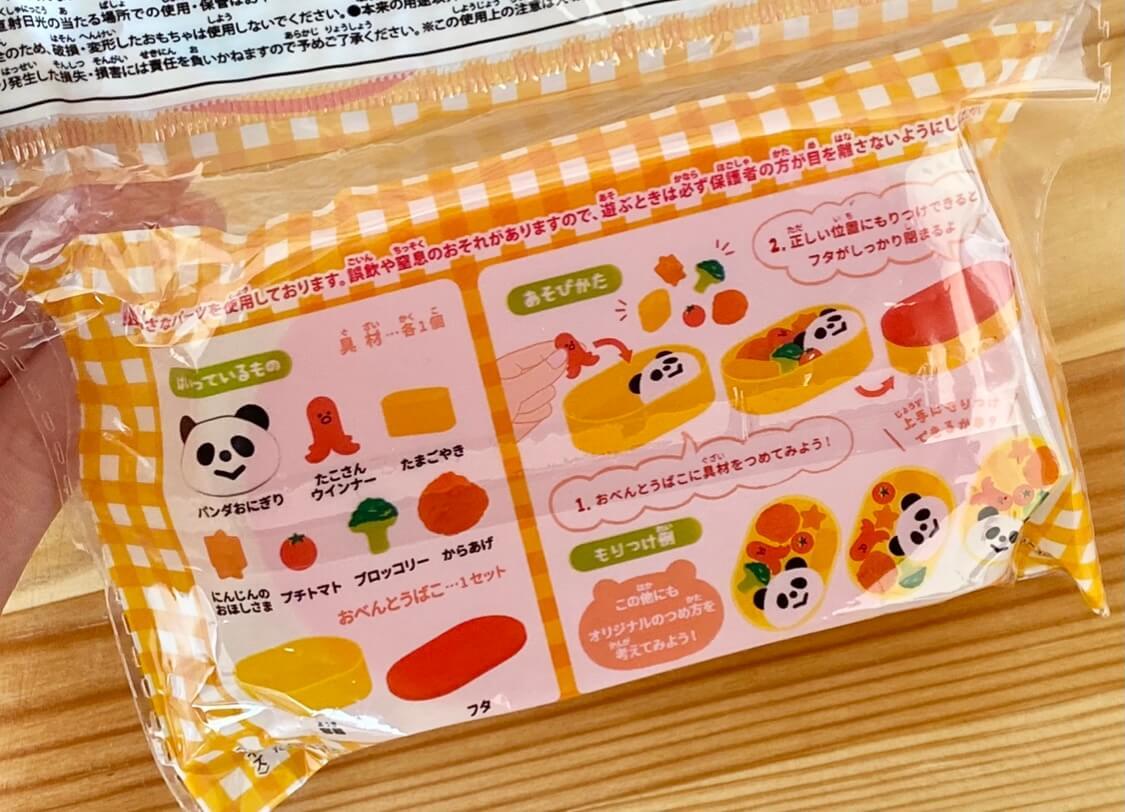 こちらの「ままごとつめつめおべんとう」は、パンダおにぎり・たこさんウインナー・たまごやき・にんじんのおほしさま・プチトマト・ブロッコリー・からあげの7種類もの具材入り。