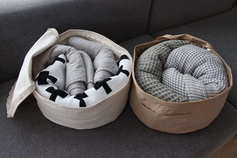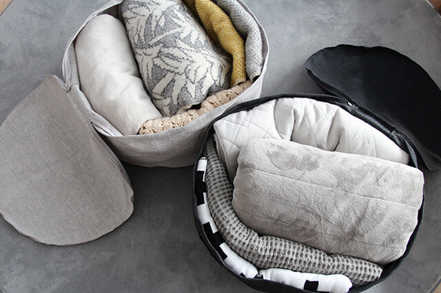 そして、新たに仲間入りしたラウンド型 ミニ(直径38cm)は、ソファの上にも設置しやすいコンパクトサイズ。夏寝具やタオルケットの収納にもおすすめです。