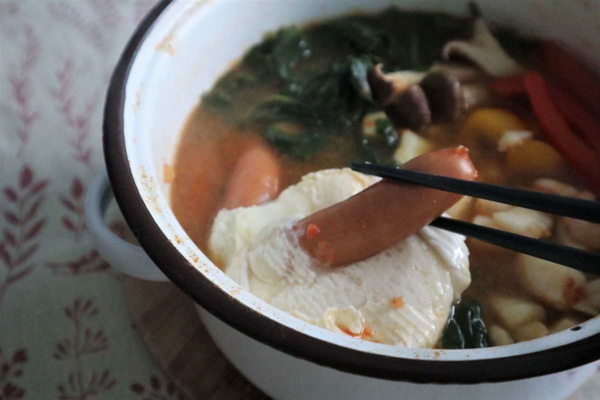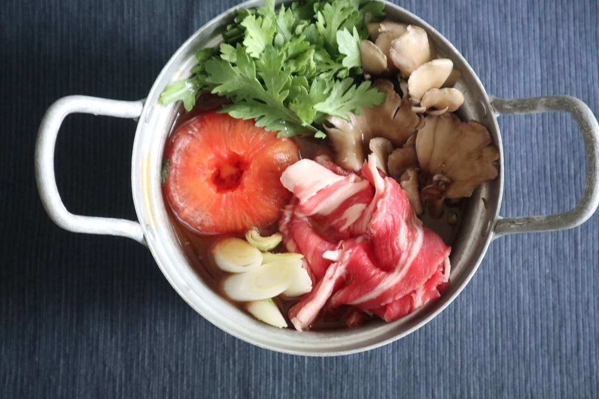 2.鍋にハリッサの鍋の素と水を加えて混ぜる。材料を全て加えて蓋をして中火に