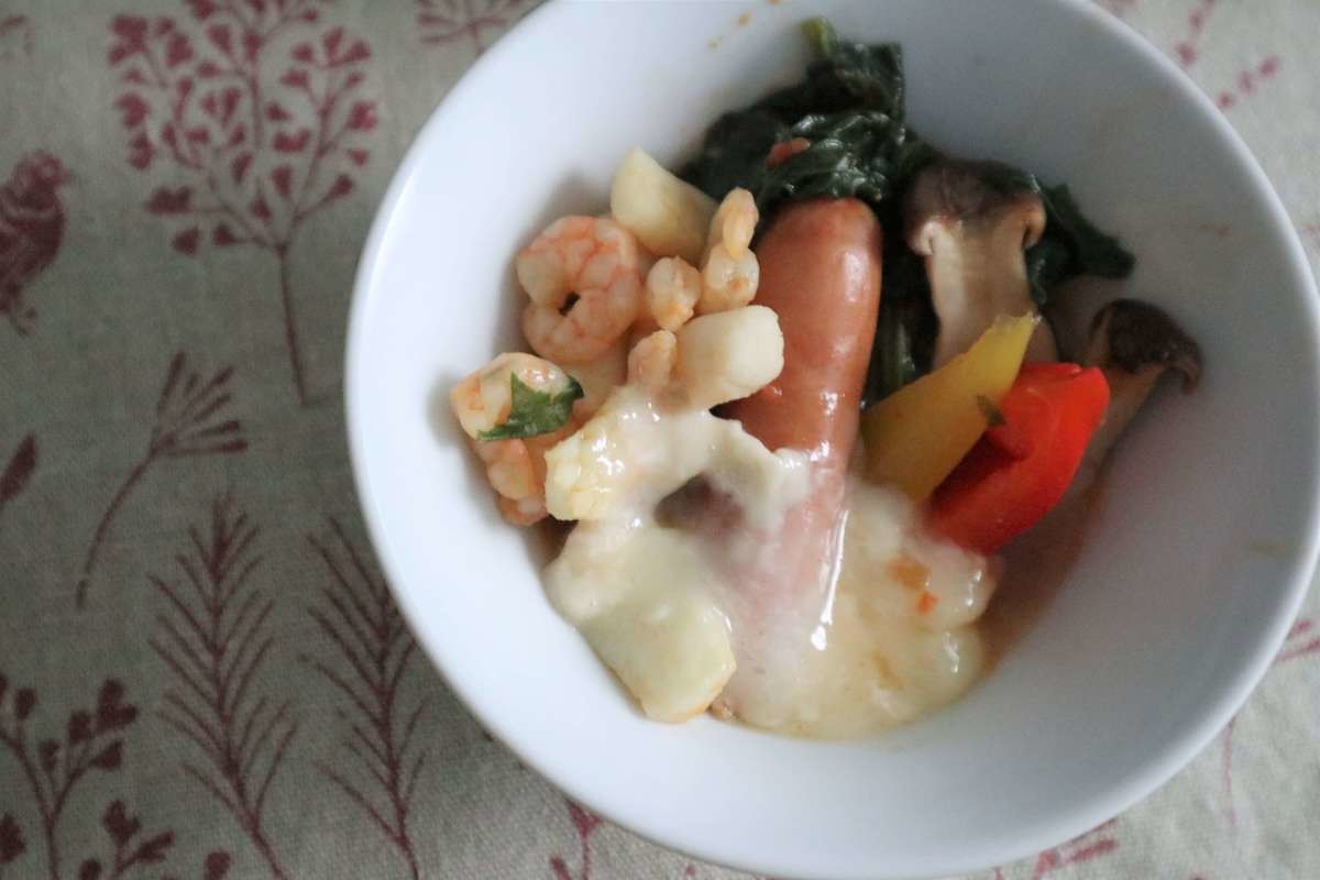 かけてシーフードミックスに火が通るまで煮る。
