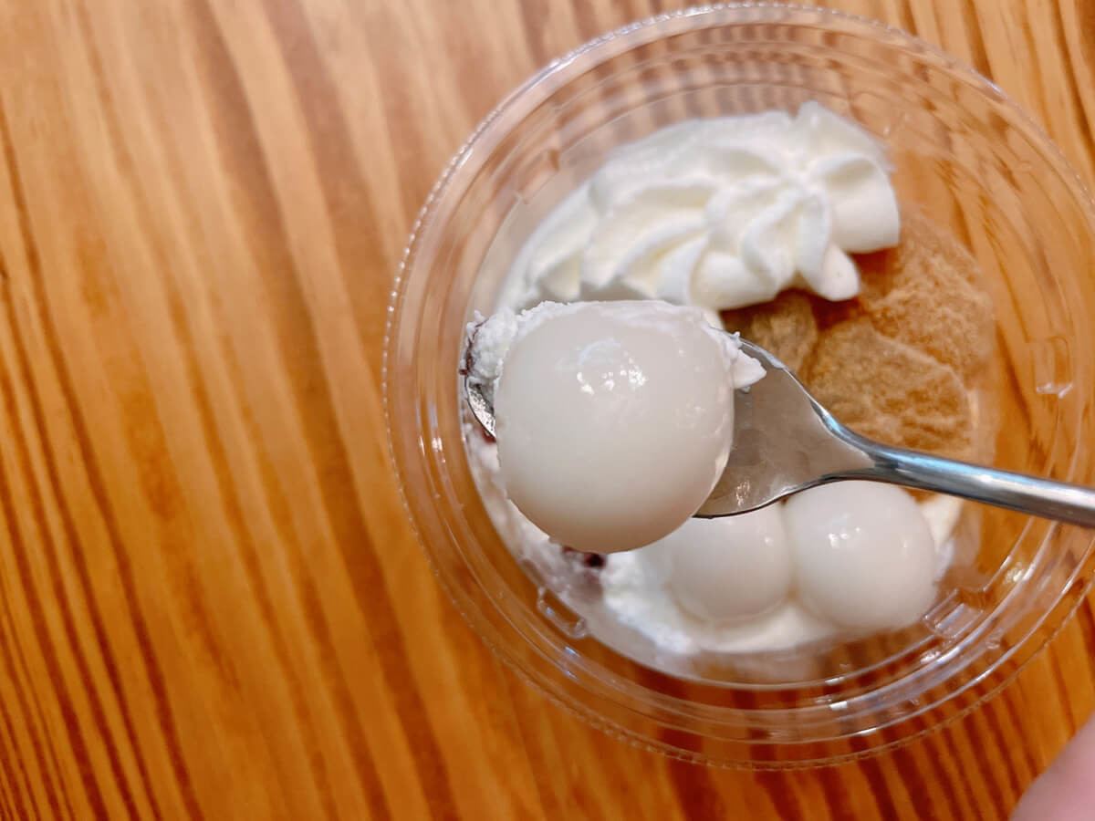 大好きな白玉は、つやつやの見た目ともっちりとした食感で安定の美味しさ♪スプーンで簡単に切れるほど柔らかく、口の中にお米の良い香りが漂います。
