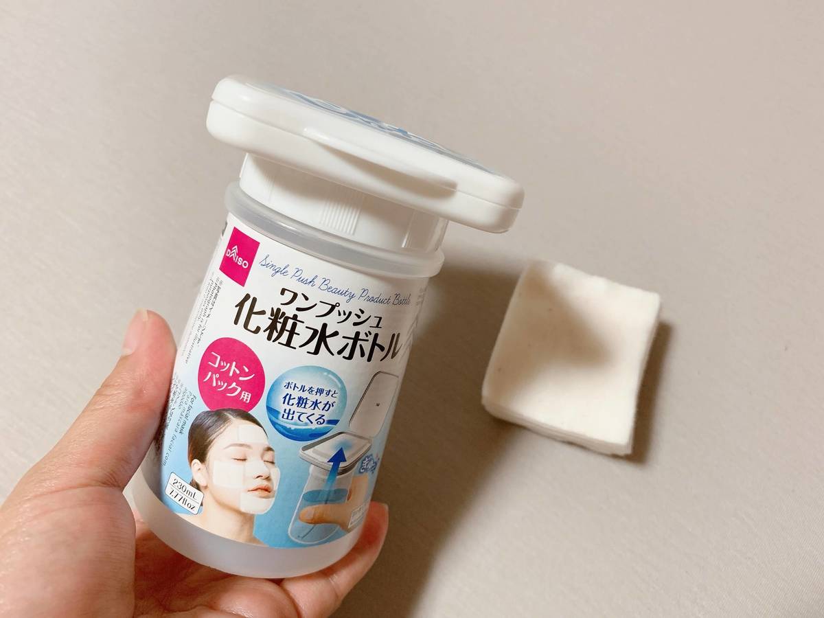 こちらは、SNSで話題になり爆発的な人気を誇っている「ワンプッシュ化粧水ボトル」(110円 税込)。手軽にコットンパックができちゃう優れものです!