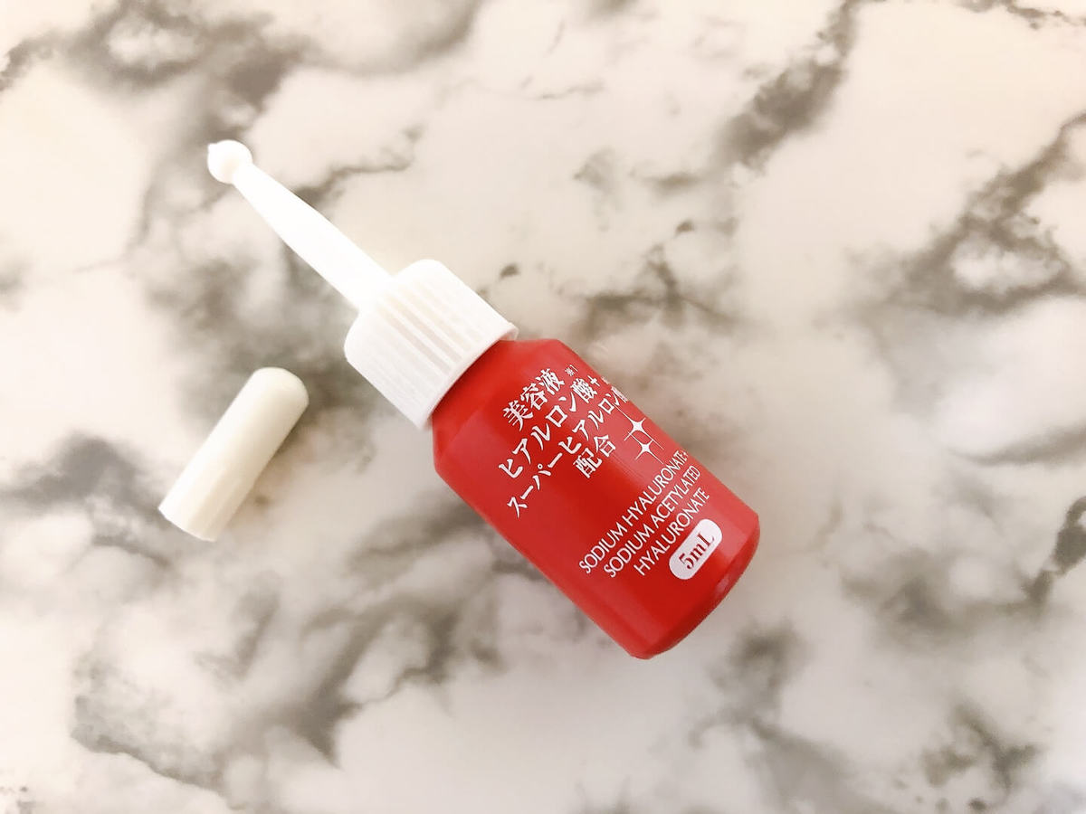 真っ赤な容器に「ヒアルロン酸+スーパーヒアルロン酸」配合と記載されているこちらは、ダイソーの隠れた名品「DエッセンスHSH美容液」(110円 税込)。