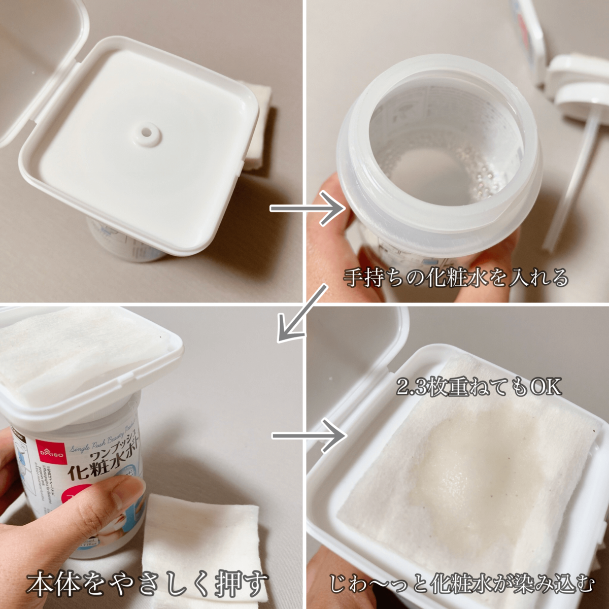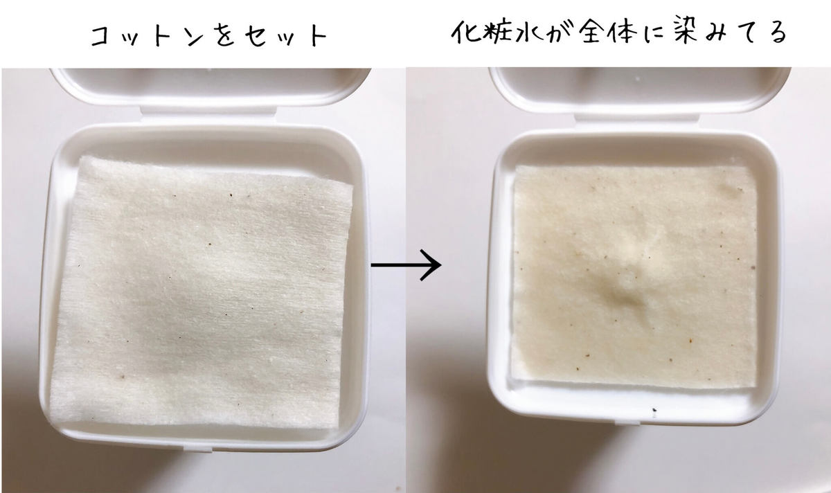 ワンプッシュで、コットン全体に化粧水が染み込みます。驚くほど簡単にできるので、快感ですよ♡