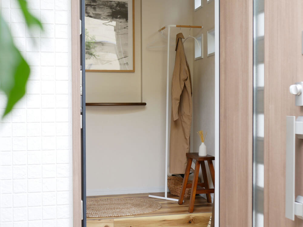 スリムでシンプルな佇まいは、手狭な玄関にも助かりますね。 帰宅後や来客時の上着の一時掛け、雨の日はたたきに掛けて、レインコートの一時干しにも便利。