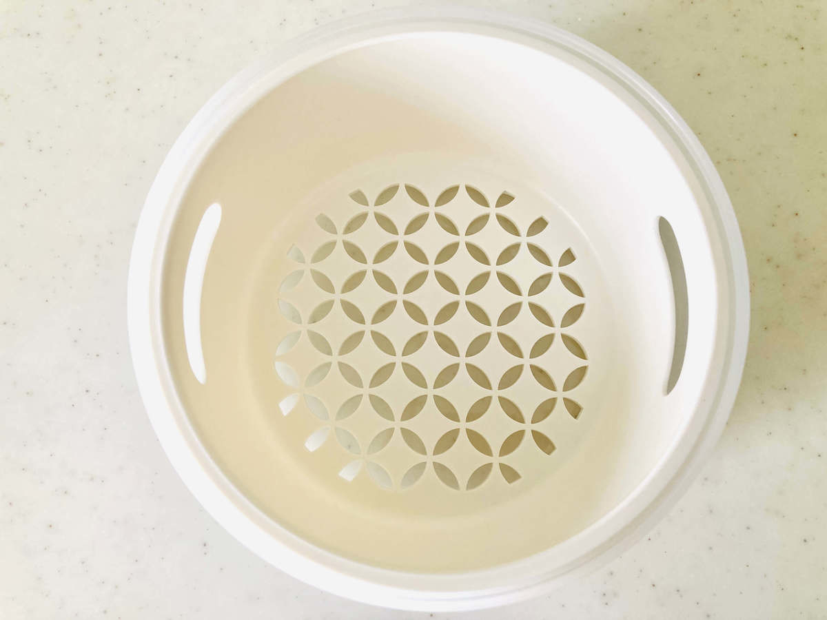 フタを開けると、水切り用のザルが入っています。水切り穴の模様が美しすぎました!レトロさを感じるモチーフで、めちゃくちゃおしゃれです。