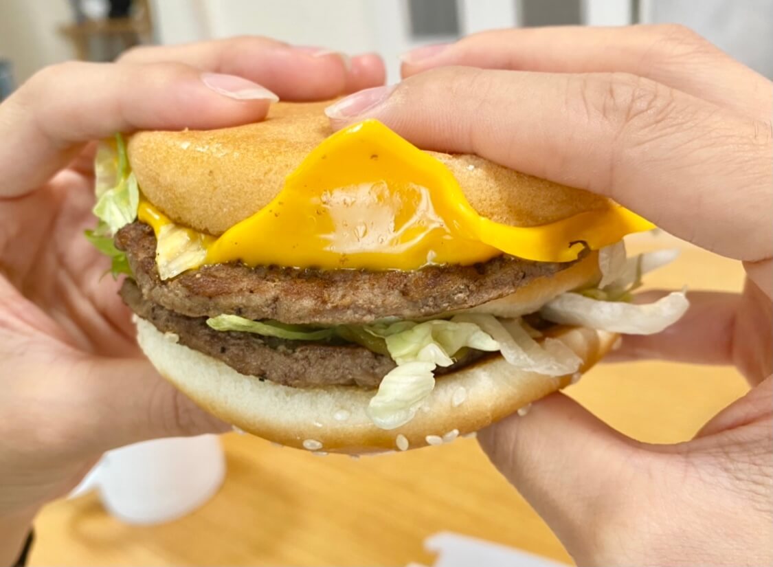 2枚の重いパティが上にきて、軽いレタスが下になります。そうすることで上からの重みで押さえつけられ、具材同士がズレにくくなるんだとか♪