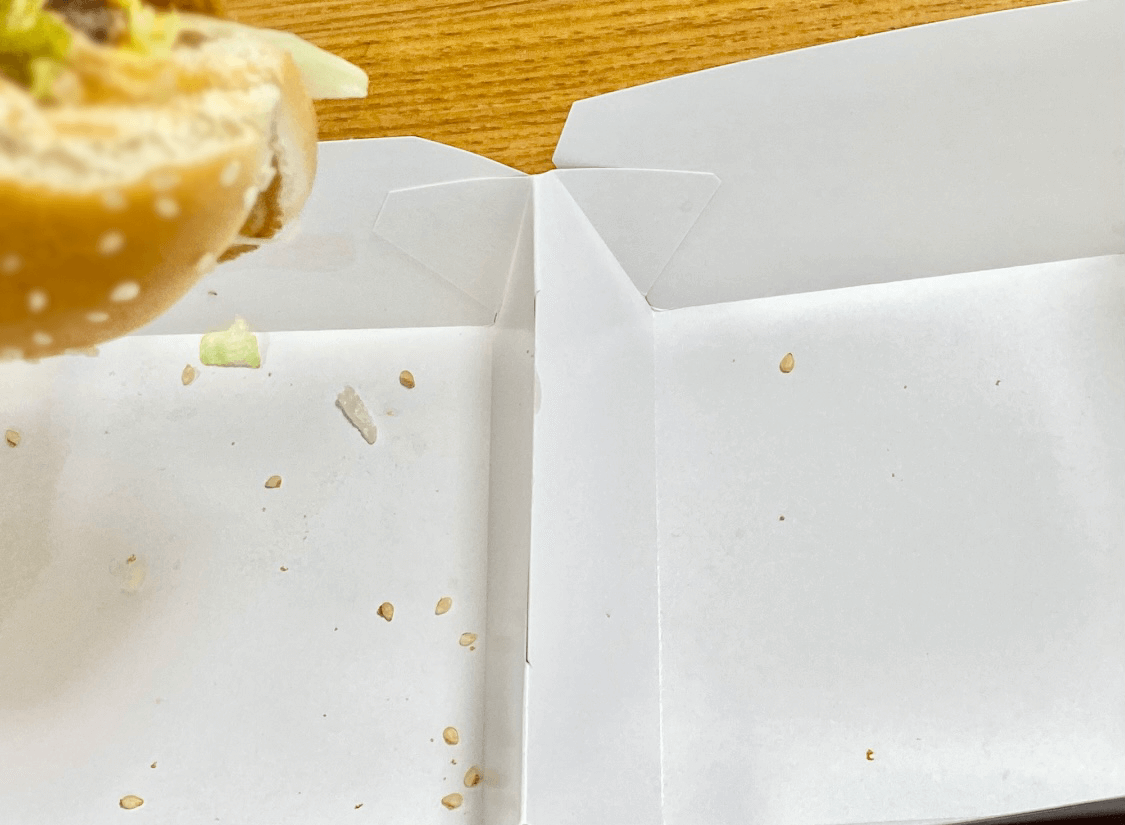 ハンバーガーをひっくり返す手間を省くために、最初から箱を逆さまにしてから開けるのもオススメですよ。
