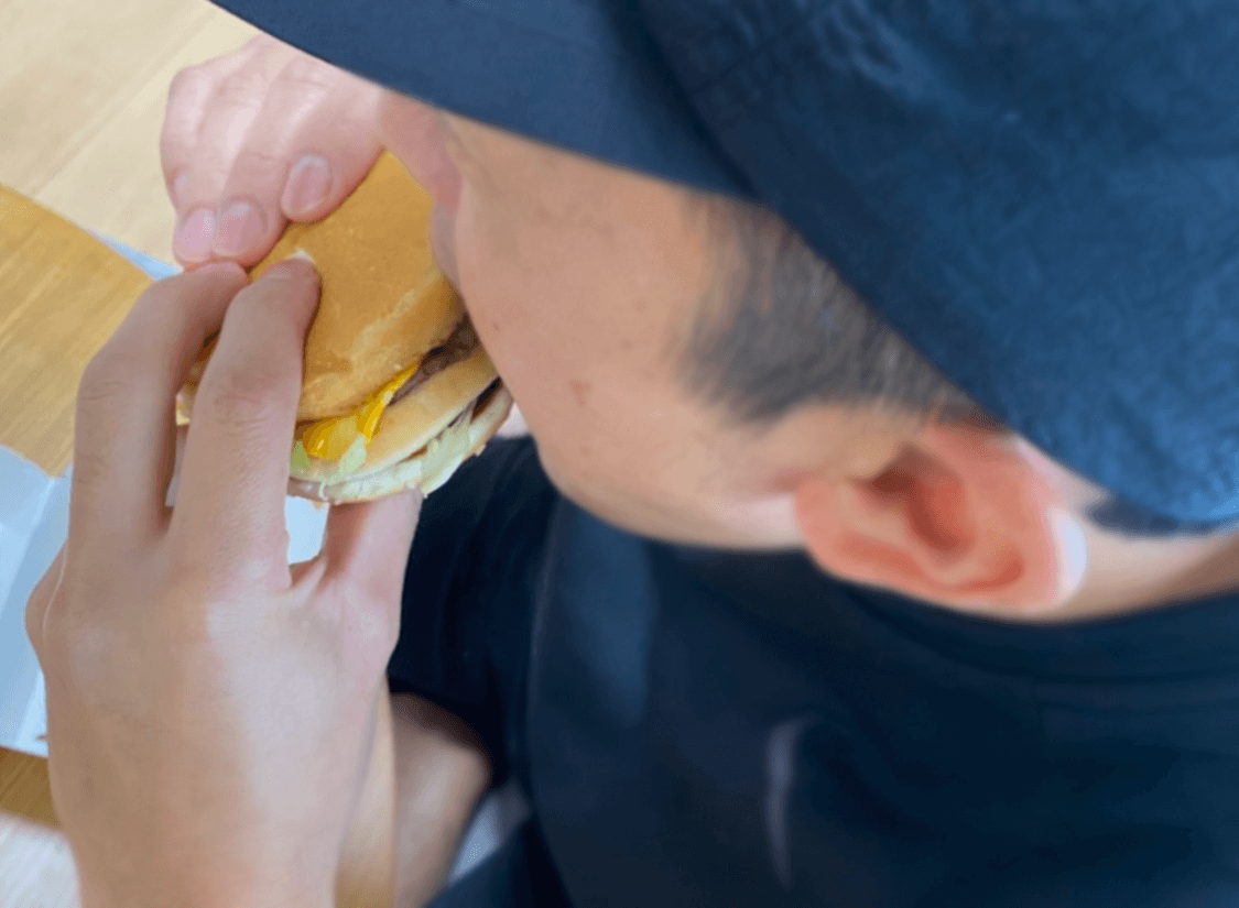 上下の前歯を合わせ、ハンバーガーを垂直に噛み切るイメージで食べていきましょう!