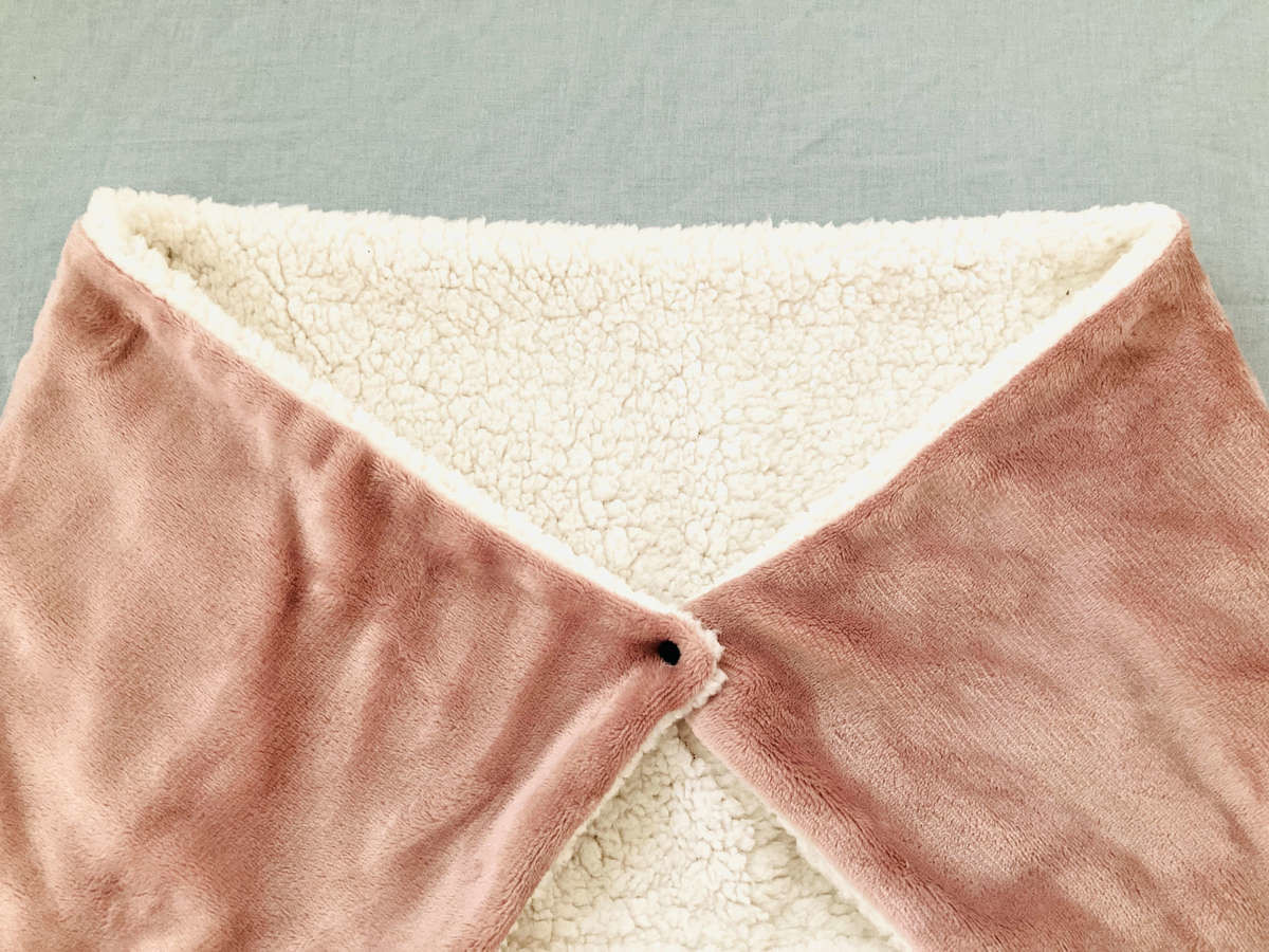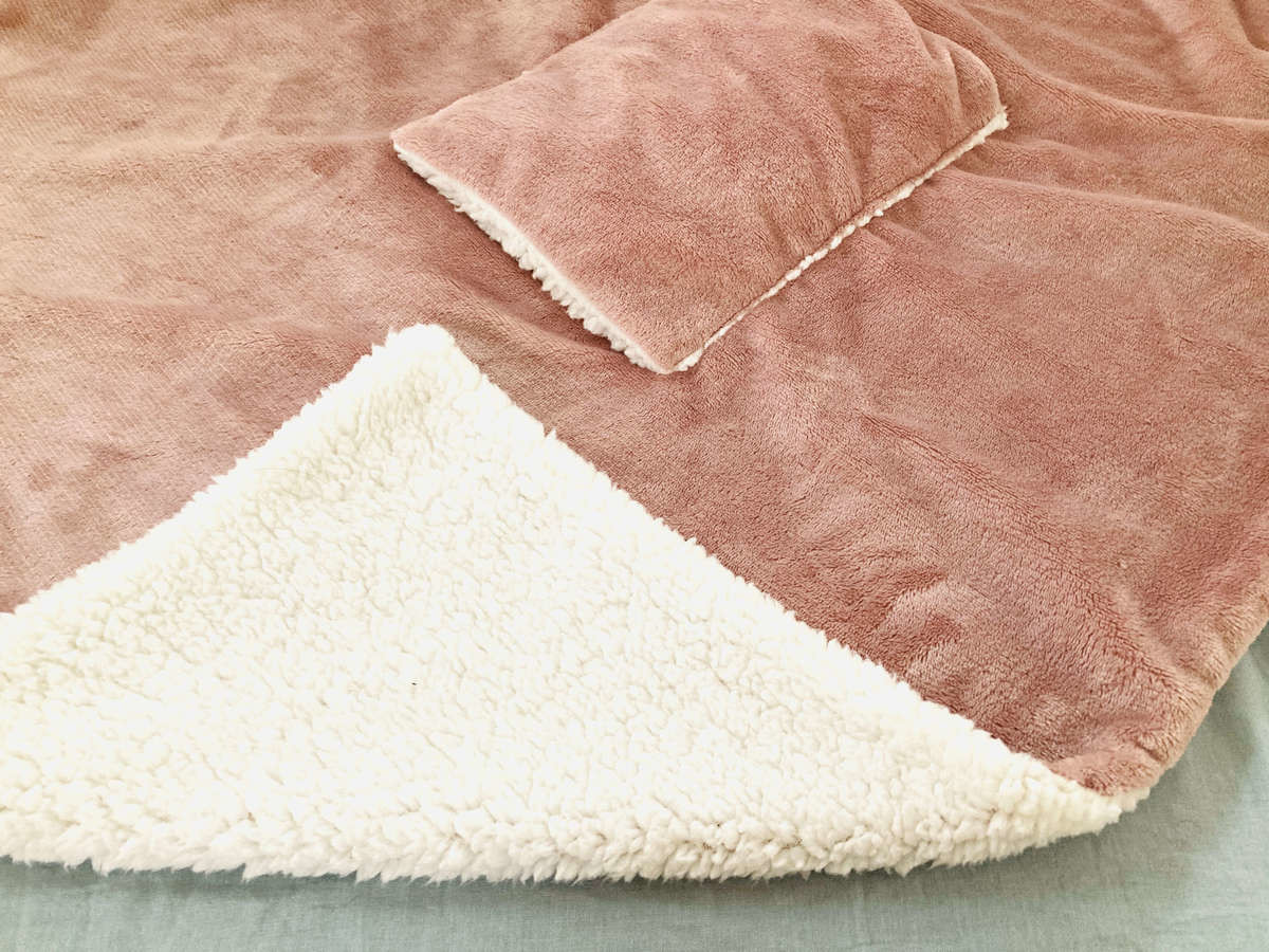 綿入りのポケットは枕にもなります。こんなブランケットがあったら、人をダメにしてしまいそう。小学生の息子も「ふわふわで暖かくて気持ちいい♪」と大満足の様子でした。