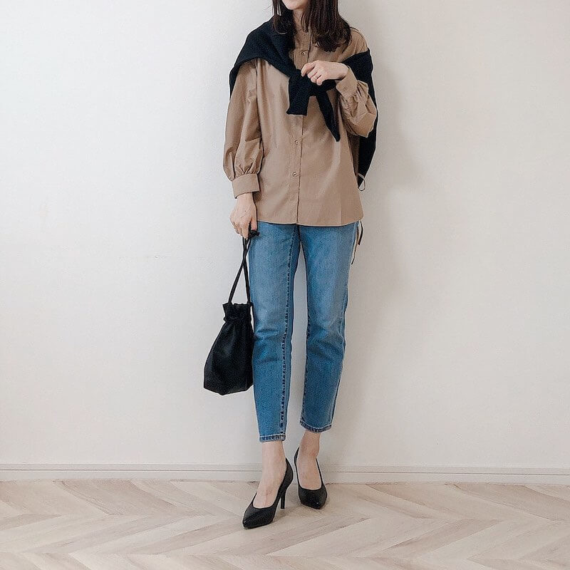 ギャザーシャツを着こなしたシンプルなルックスに、肩掛けニットをオン。