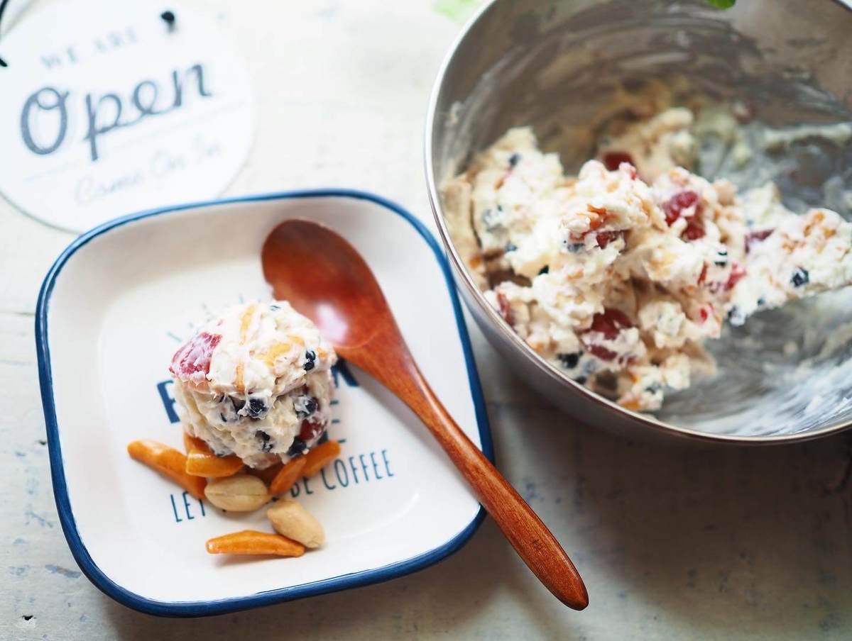 そこに、細かくカットしたドライフルーツと柿の種を加えて、さらに混ぜます。