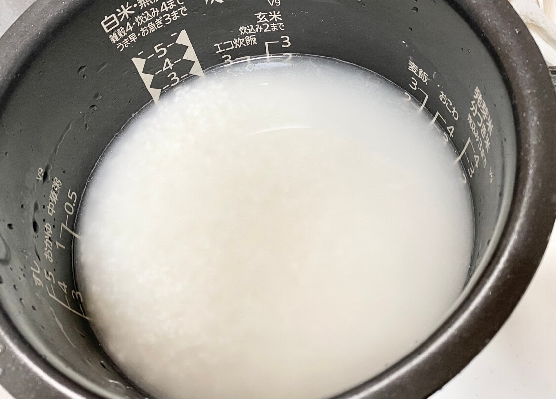 研いだお米を、炊飯器に入れて、既定の目盛りまで水を入れます。