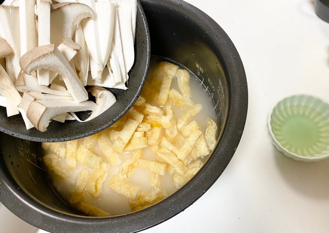 松茸のお吸い物で炊き込みご飯①炊飯器にお米と水、具材を入れる