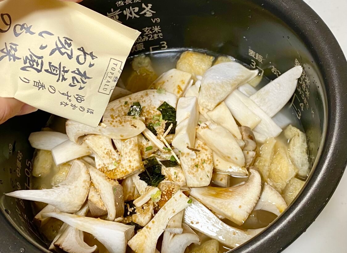 松茸のお吸い物で炊き込みご飯③お吸い物のもとを入れて、炊く