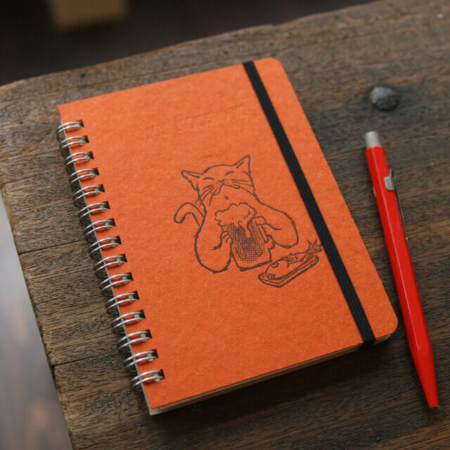 サカナをおつまみにビールを楽しんでいるネコの姿がかわいい、リングノートタイプの手帳です。