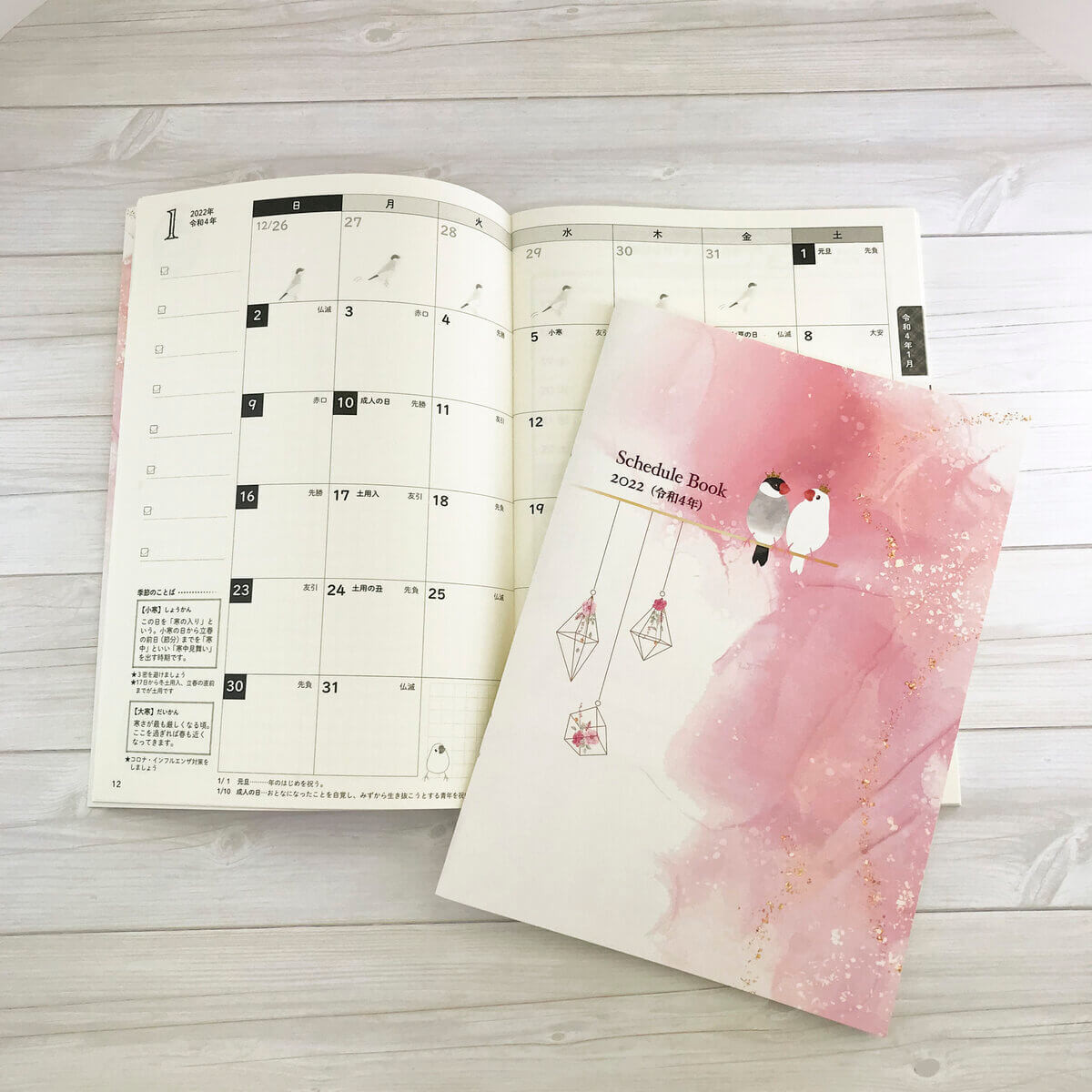 やさしいピンク色に寄り沿う文鳥さんがデザインされた多機能スケジュール手帳。