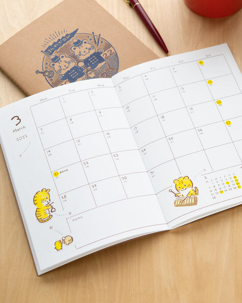 2022年の干支の「トラ」をほんわかアレンジした、かわいいキャラクターが描かれた手帳です。