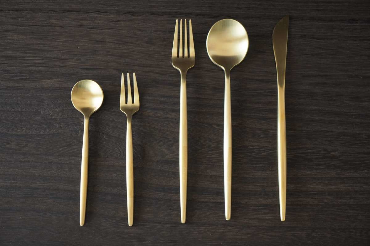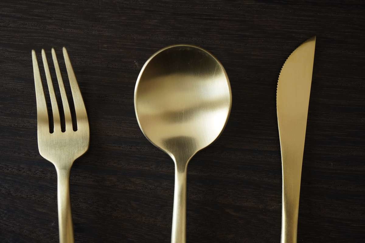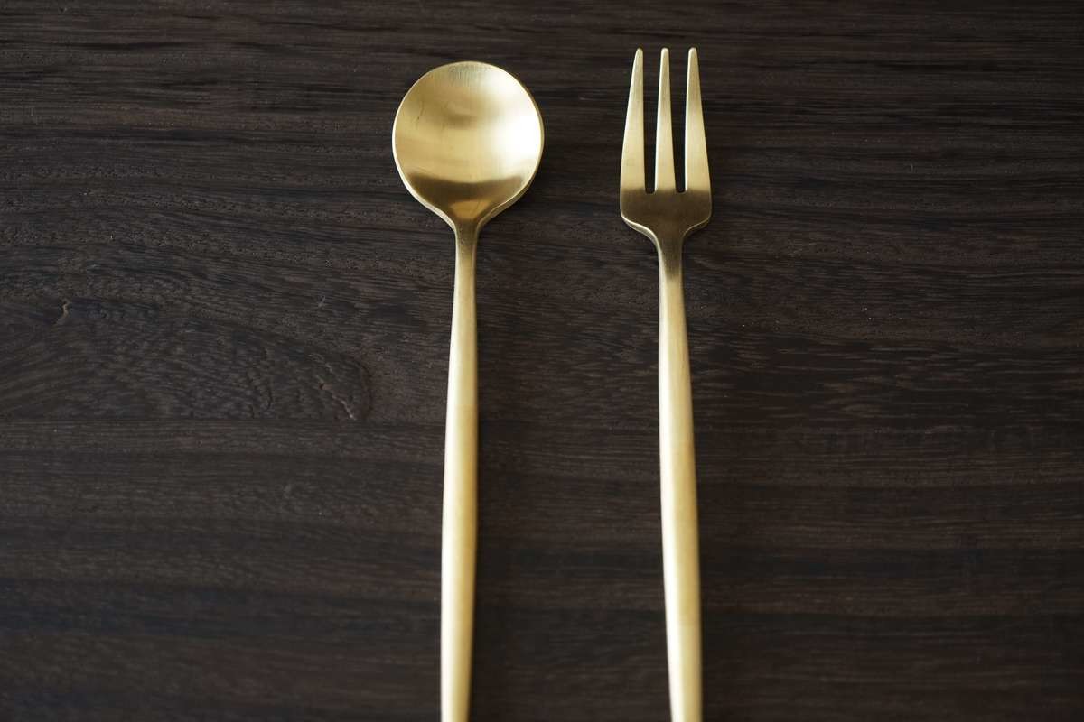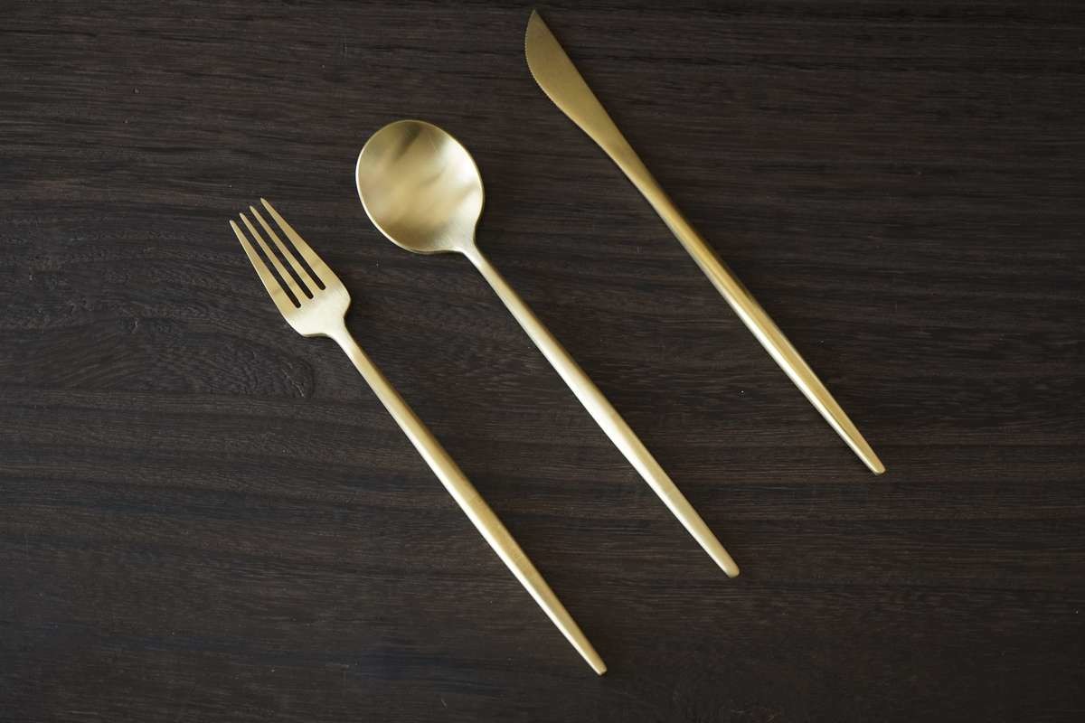ゴールドのカトラリーはハロウィーンやクリスマスに使えば華やかな雰囲気になり、黒や茶系と相性がよいのでこれからの季節におすすめのカラーです。