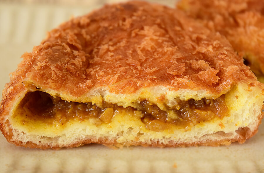 舌がピリッとしたけれど、後を引くような辛さはありません。確かに前述のカレーパンよりは辛みが増しているものの、市販カレールウでいうところの「中辛」「星の表示は5段階中2か3」程度と同じくらい。