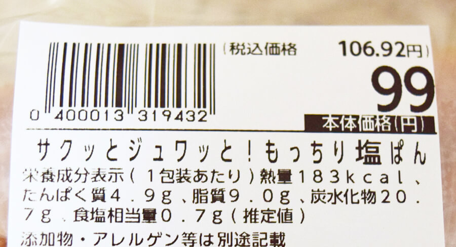 惜しくも100円オーバーしていますが、本体価格は99円。塩ぱん以外にも本体価格99円のパンが複数あり、低価格を実現していますね。