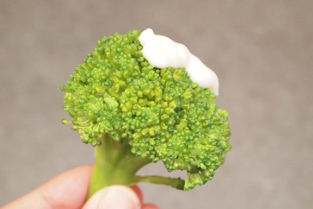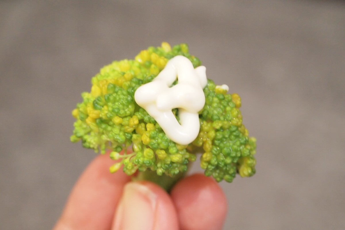 次にチルド室で1週間保存したブロッコリーも茹で、マヨネーズをかけて食べてみます。