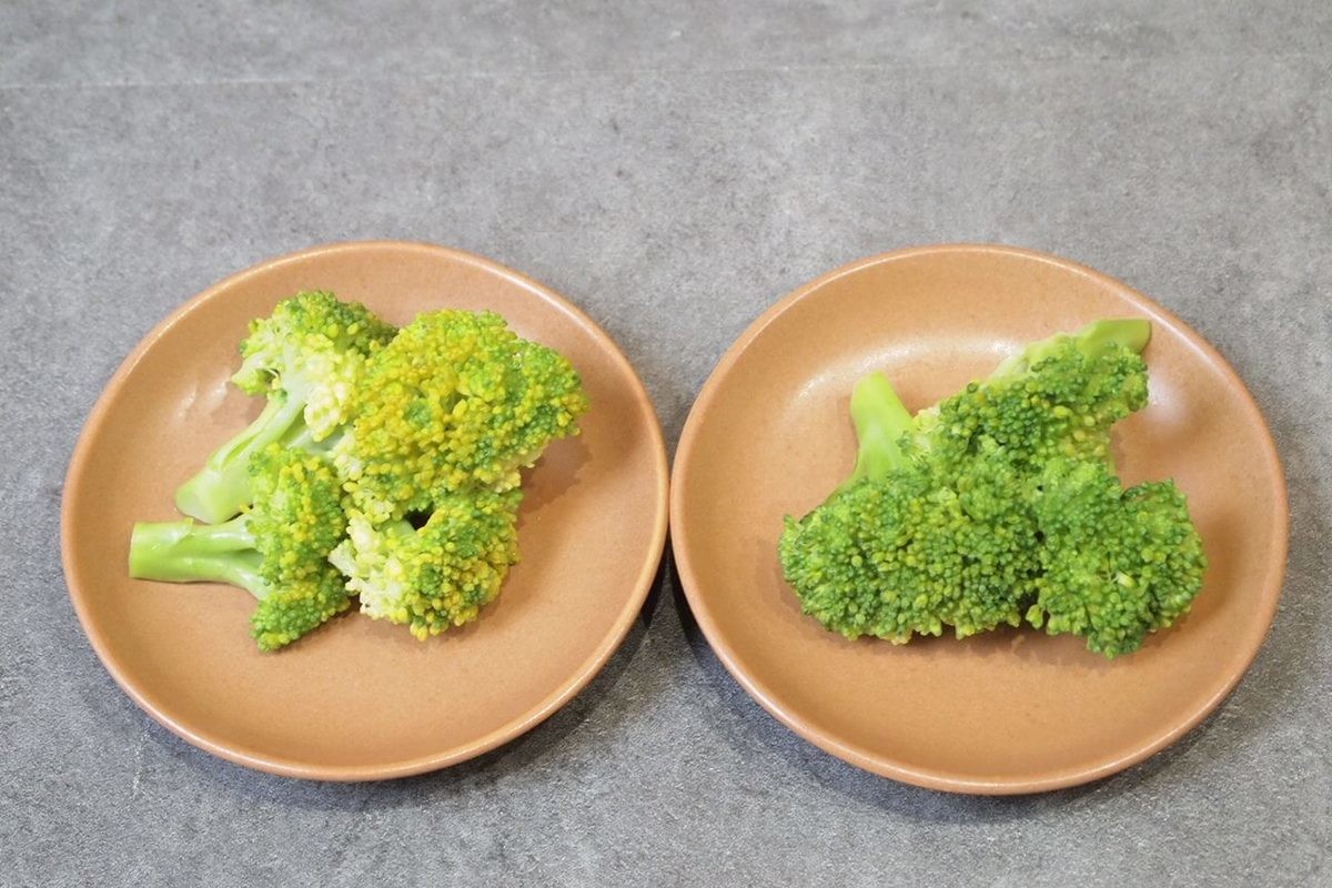 ▲(写真左:野菜室で保存したブロッコリー、写真右:チルド室で保存したブロッコリー)