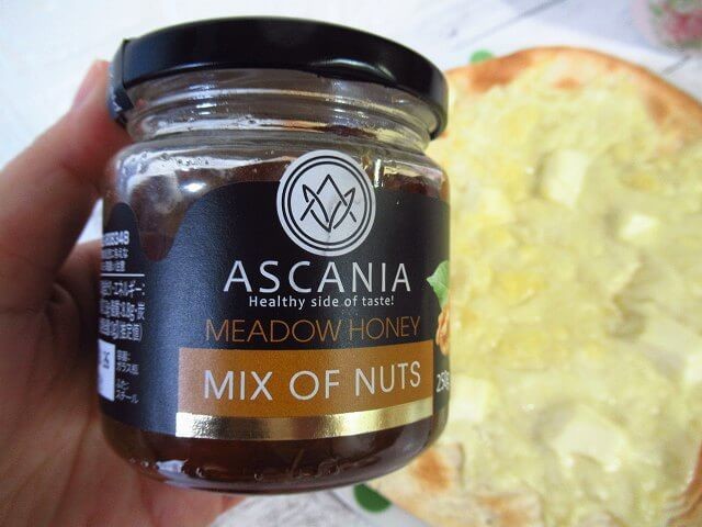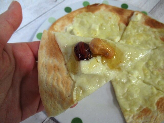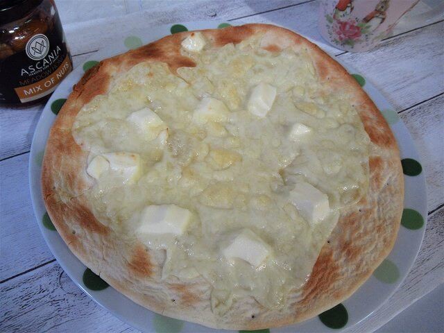 今回は、とろけるチーズとクリームチーズをたっぷり乗せて焼き、おなじく業務スーパーで購入した「4種のナッツのはちみつ漬け」をつけてみました。