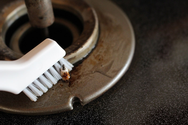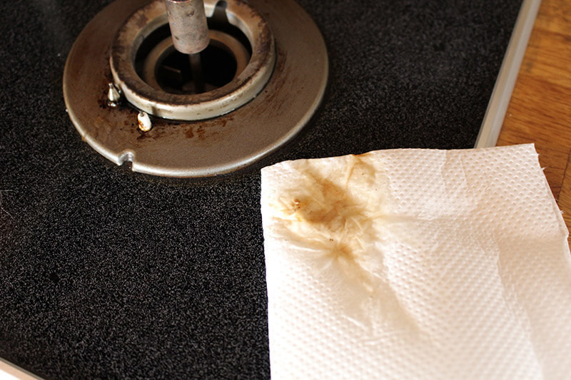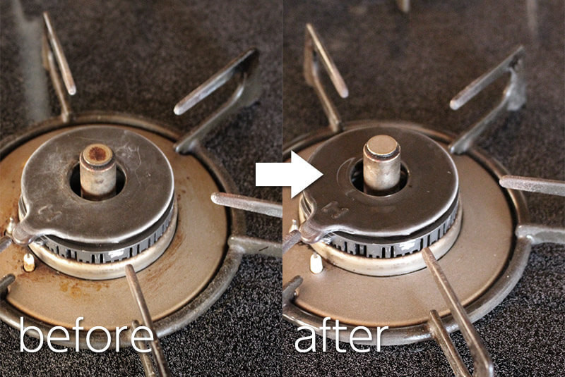 続いての汚れは、日々の拭き掃除では追いつかないコンロのベタベタ。油汚れ用の薬剤を使って掃除していきます。