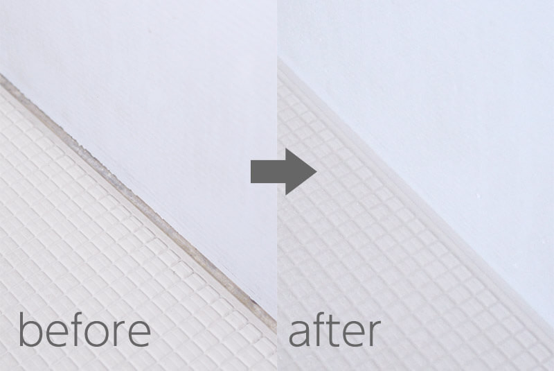 まずはシリーズの中でいちばん注目度の高い「カビ取り用洗剤」から試してみます。掃除場所はお風呂のパッキンの黒カビ。市販の洗剤で落ちず、どんどん黒さが増してくるので困っていました。