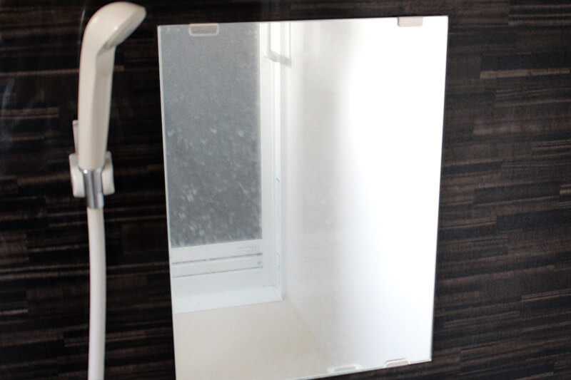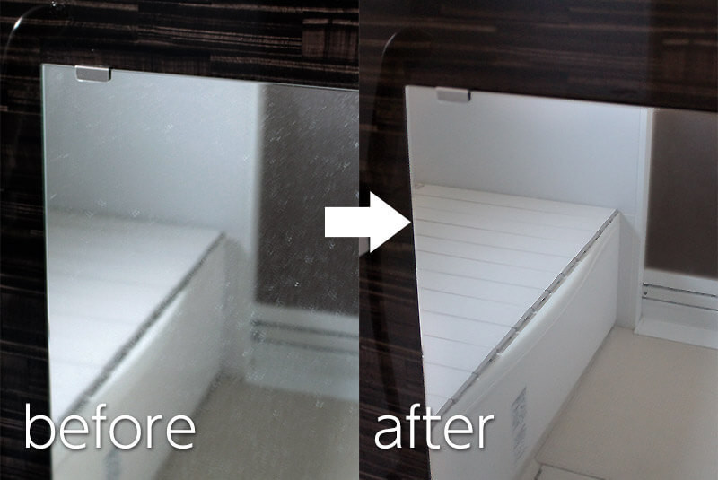 最後はお風呂場の鏡です。ウロコがあっても「濡らせば映るから」と掃除をサボっていたせいで、かなりガンコな汚れになってしまいました。