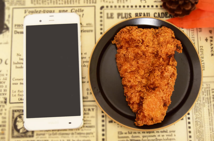 チキンカツ1枚とスマートフォンを並べてみました。チキンカツは自前のスマートフォン(149×73×7.6mm)画面よりも大きい。