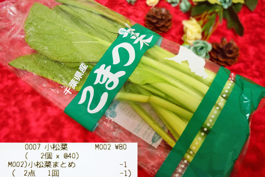 揚げ物系を買いに行こうとセレクションに立ち寄ったら、小松菜が1束40円(税込)。しかも、まとめ買いしたため、1円割引されていました。
