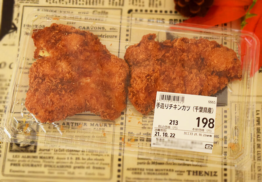 大きめのチキンカツが2枚入って213円(税込)。特段「激安」ではないものの「あと1品」にちょうどいいので、よく買っています。