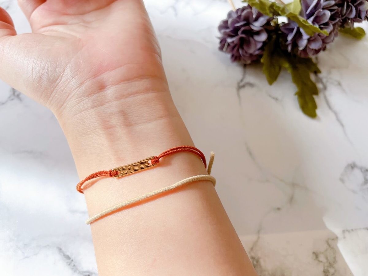 ゴールドの金具といい、繊細な紐やくすんだカラー、普通にただのオシャレなブレスレットに見えますよね。