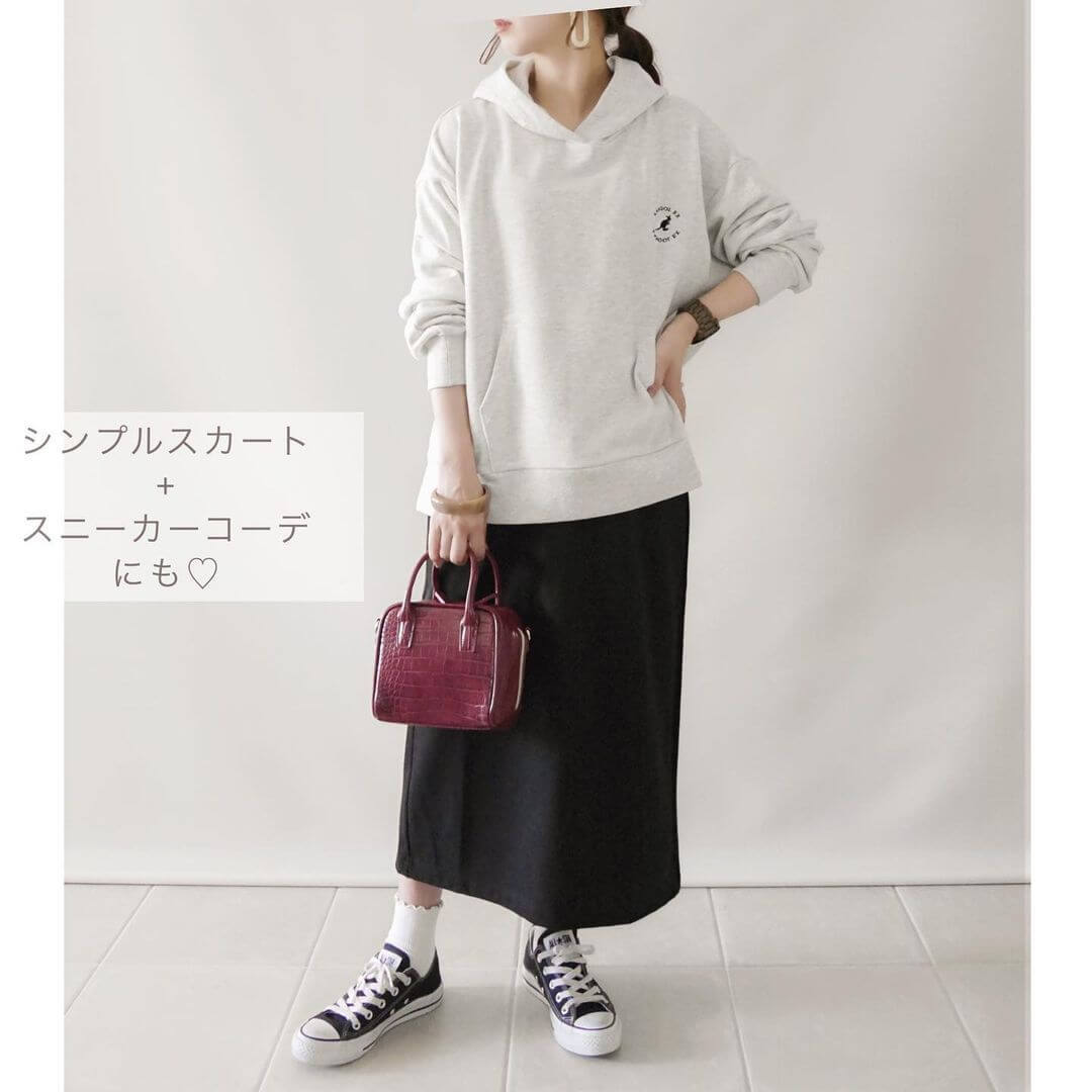 パーカー&タイトスカートは今季マネしたい上品スポーティなミックスコーデ。