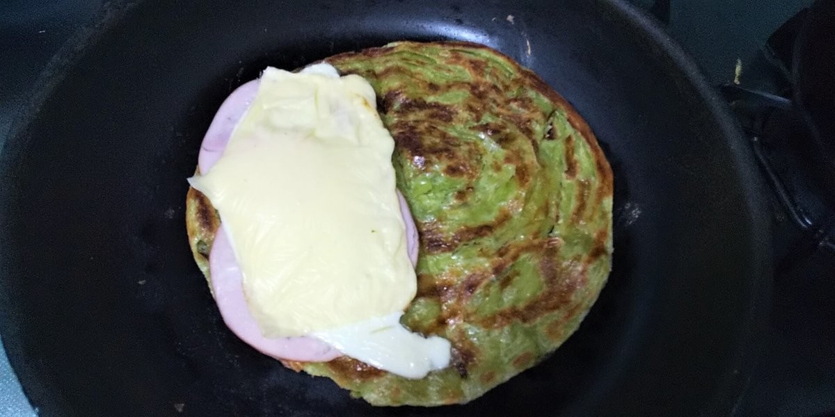 ハムを乗せる前に、ヘラなどで少し半分に折るための折り目をつけるのをオススメします。