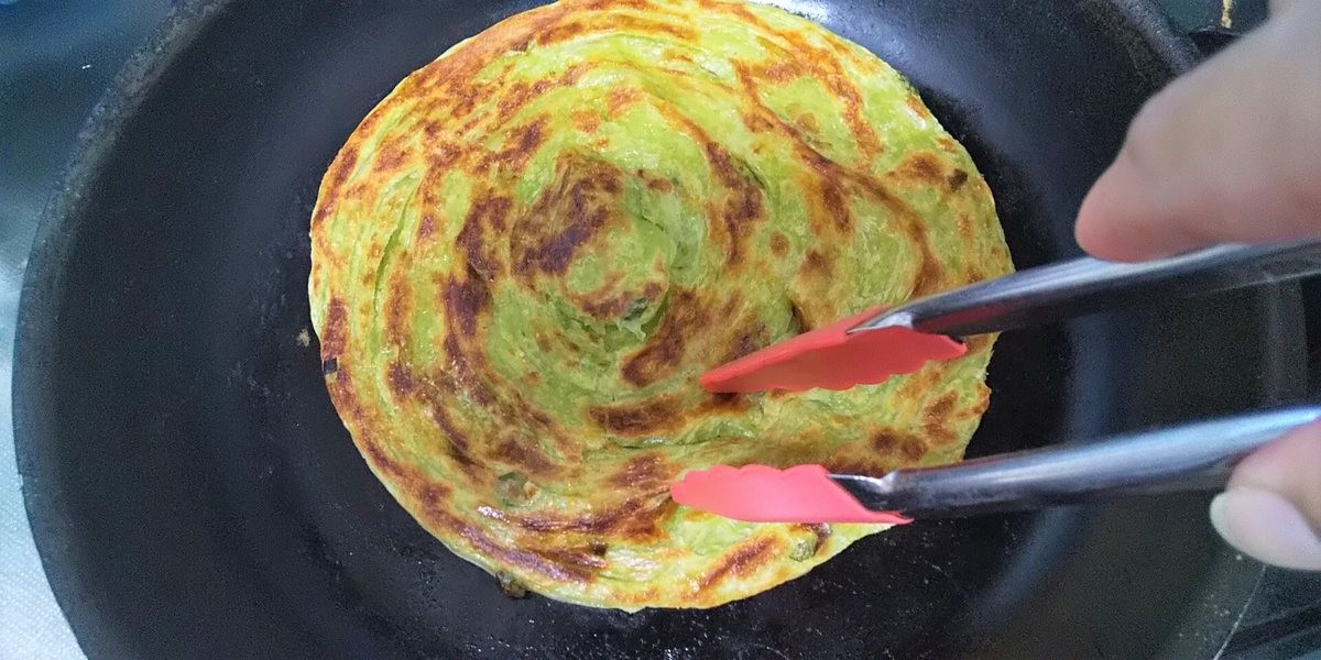 薄焼き餅の中にある油がうっすら染み出てきます。