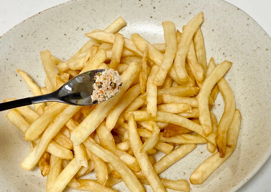 テイクアウトしたマックポテトをお皿に移し、魔法のパウダーを振りかけていきます!